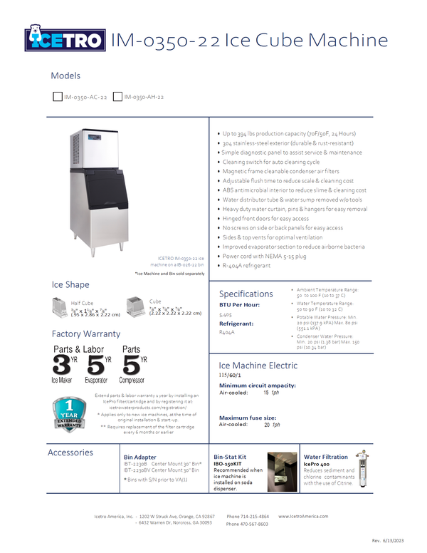 The ICETRO IM-0350-AC-22 is a high-performance Full Cube ice maker paired with the IB-026-22 ice storage bin, designed to meet the demands of both small and large businesses. Whether you operate a bar, café, restaurant, or commercial kitchen, this compact 22" wide unit fits easily into tight spaces while delivering outstanding output.