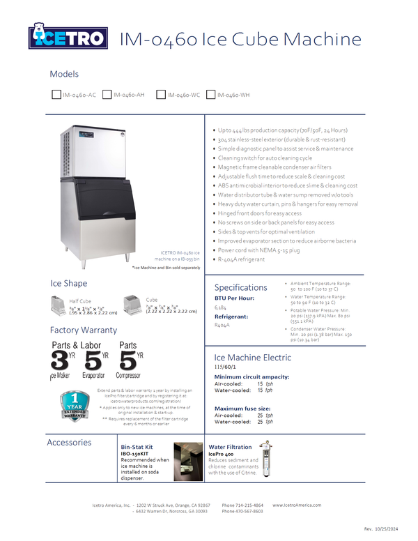 The ICETRO IM-0460-AH is a high-performance Half Cube ice maker paired with the IB-033 ice storage bin, designed to meet the demands of both small and large businesses. Whether you operate a bar, café, restaurant, or commercial kitchen, this 30" wide unit fits easily into tight spaces while delivering outstanding output.