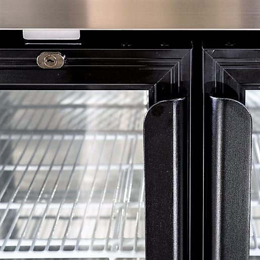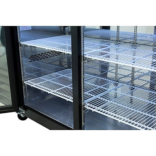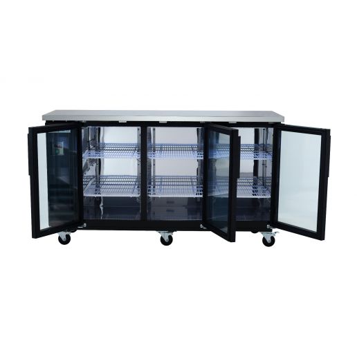 The Regal 73” Back Bar Swing Door Refrigerator (RBB-24-73G) has three high-quality, lockable glass swing doors, six durable and adjustable wire shelves, and mountable 4” casters that are easy to install.
