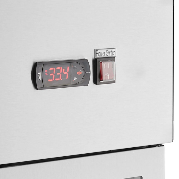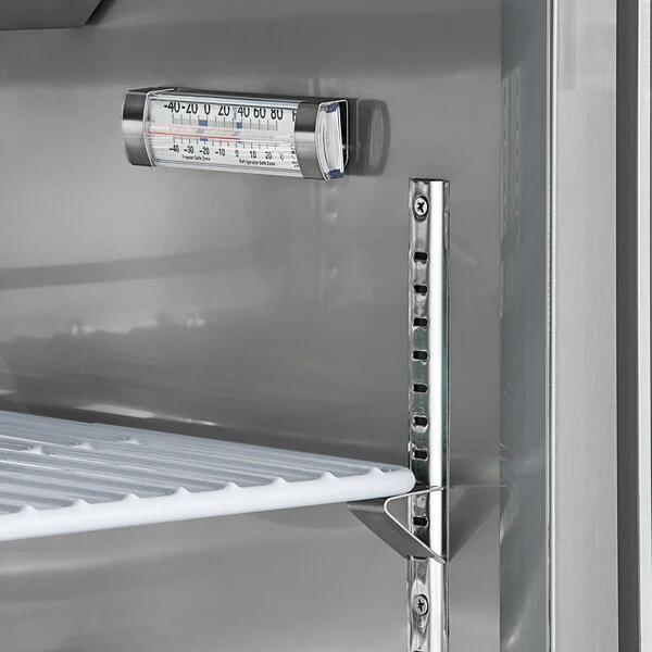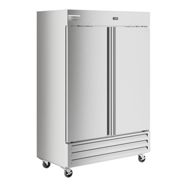 There are 2 solid doors with locks on this reach in bottom-mount stainless steel freezer that can remain open at 90 degrees. The reach in bottom-mount stainless steel freezer has foam insulation and uses CFC free refrigerant, holding temperatures between and 0 to -10 degrees F.