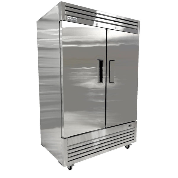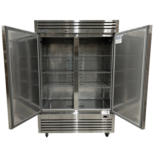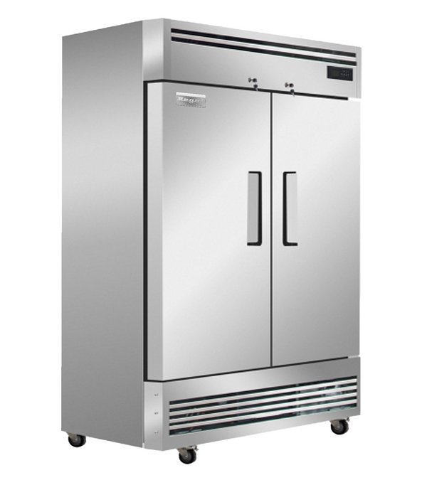 There are 2 solid doors on this reach in bottom-mount stainless steel refrigerator that can remain open at 90 degrees. The reach in bottom-mount stainless steel refrigerator has foam insulation and uses CFC free refrigerant, holding temperatures between and -8 to 0 degrees F.