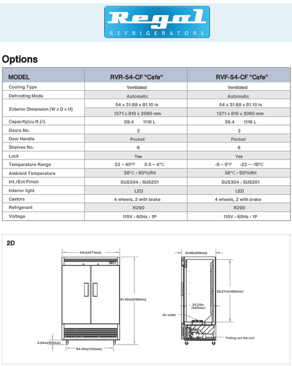 The RVF-54-CF 'Cafe' series is a 54" wide, reach in bottom-mount stainless steel freezer from Regal that provides accurate control with an electronic thermostat and an easy to read digital LED temperature display. The reach in bottom-mount stainless steel freezer has 6 adjustable, heavy-duty epoxy coated wire shelves. Storage capacity on this unit is 39.4 cubic feet.