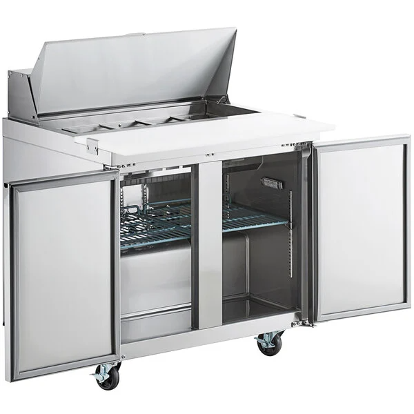 There are 2 solid doors on this stainless steel mega-top table refrigerator that can remain open at 90 degrees. The stainless steel mega-top table refrigerator has foam insulation and uses CFC free refrigerant, holding temperatures between and 33 to 40 degrees F.