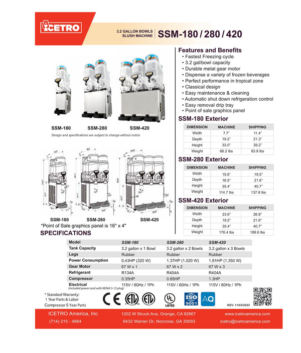 The ICETRO SSM-280 Slush Machine is a high-performance frozen beverage dispenser designed for speed, reliability, and visual appeal. Featuring two 3.2 gallon transparent bowls and a powerful .85 HP compressor, this unit delivers fast freeze times and consistent results, even in warm environments. Its stainless steel construction and durable metal gear motor make it ideal for convenience stores, bars, restaurants, and entertainment venues serving a variety of frozen and alcoholic beverages.